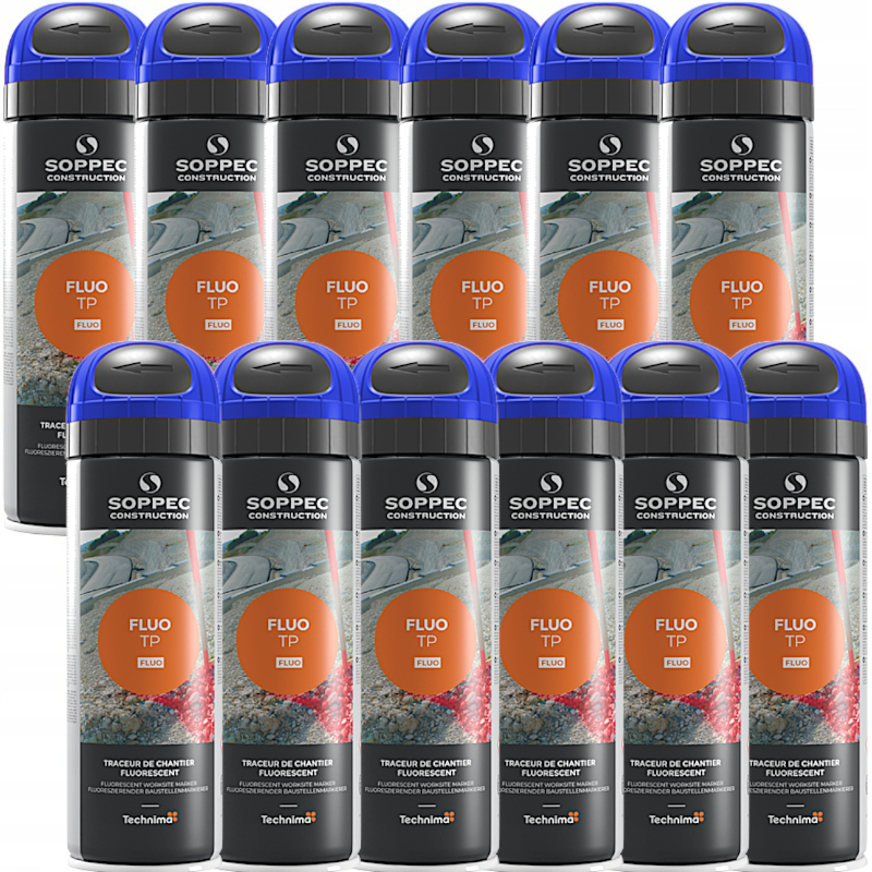 - Farba geodezyjna mocno fluorescencyjna w aerozolu Fluo TP marki Soppec do wykonywania oznaczeń na terenie budowy, o trwałości aż do 12 miesięcy