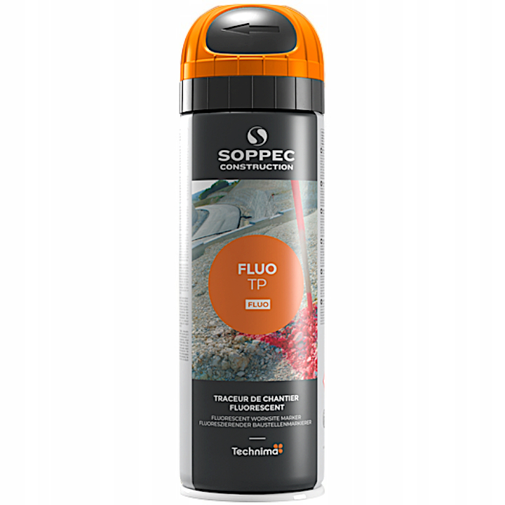 - Farba geodezyjna mocno fluorescencyjna w aerozolu Fluo TP marki Soppec do wykonywania oznaczeń na terenie budowy, o trwałości aż do 12 miesięcy